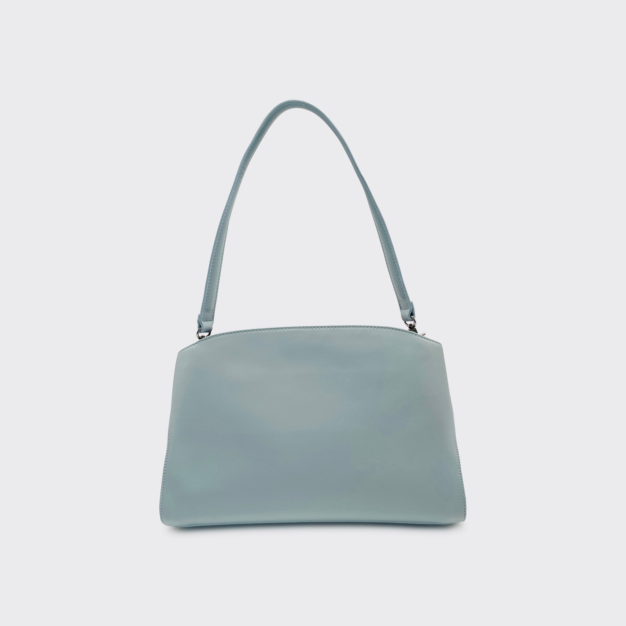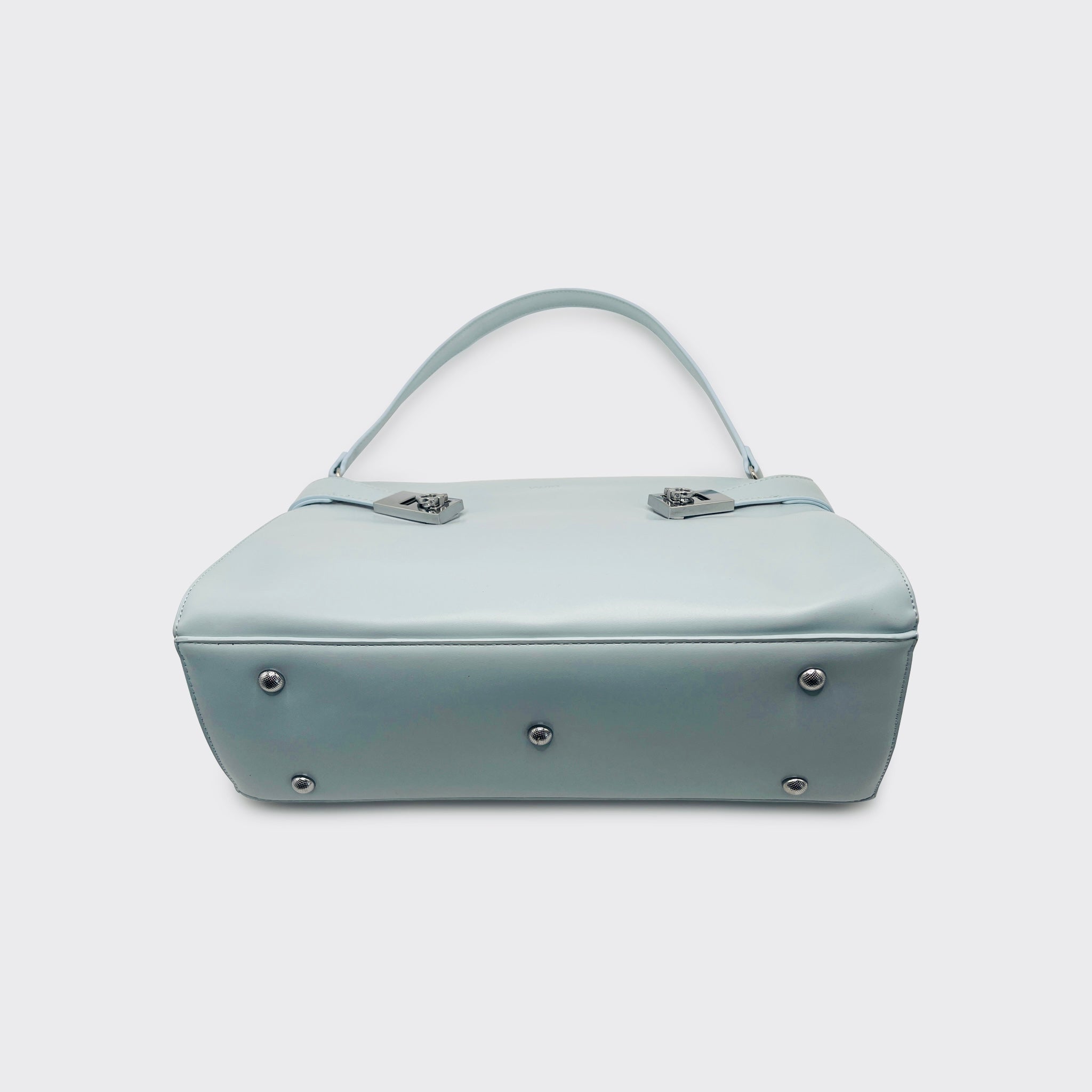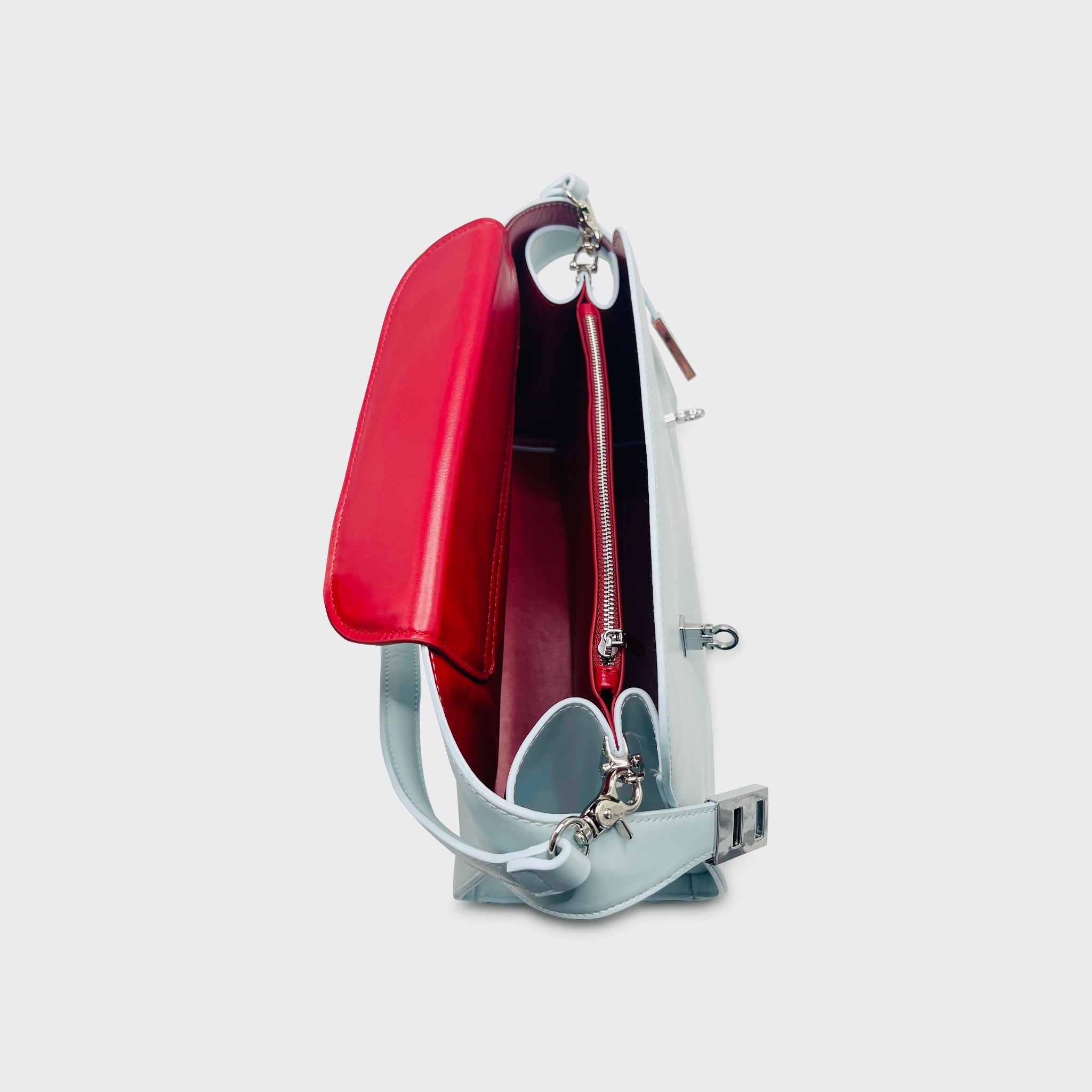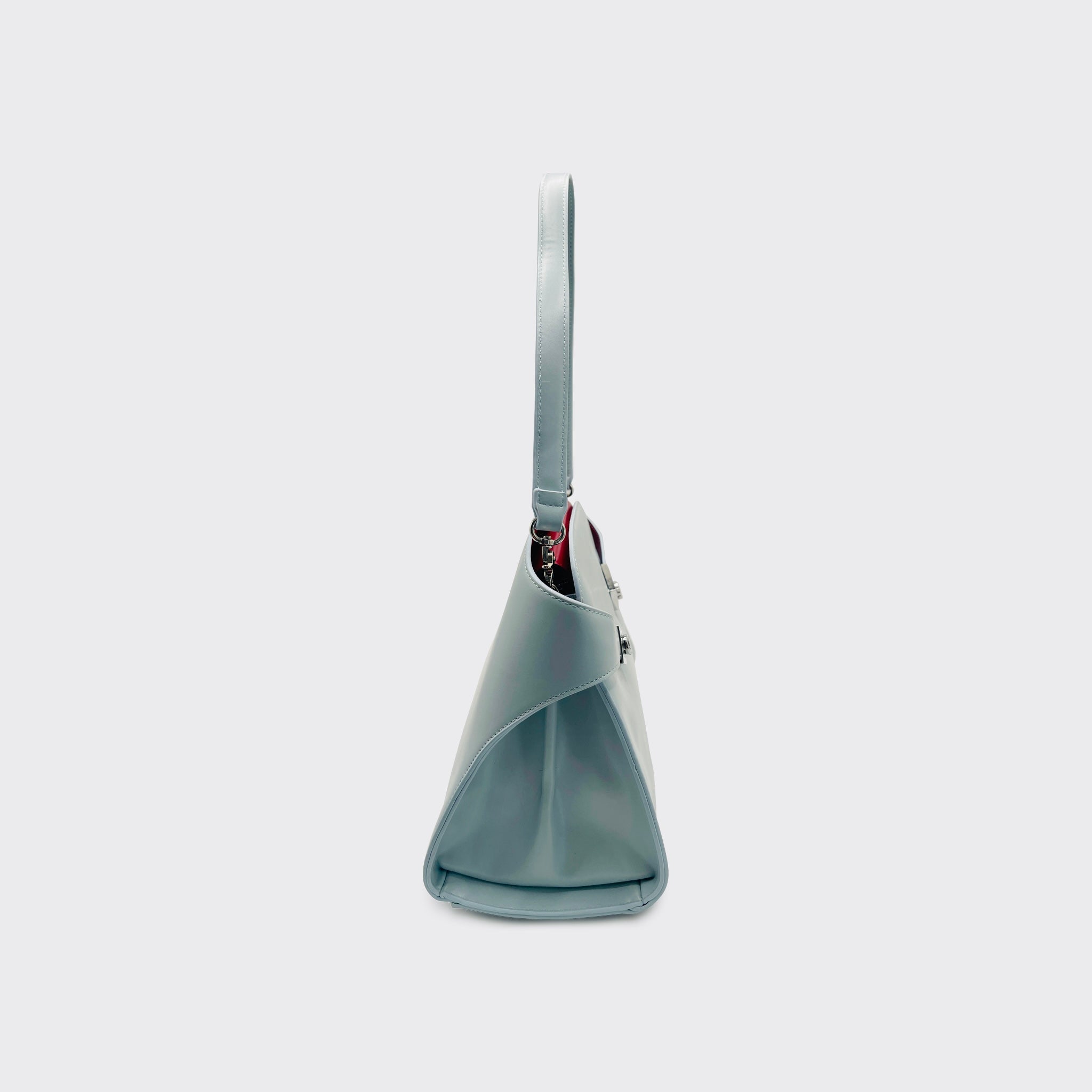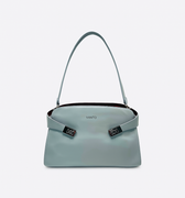 The Revenant in Steel Blue is one of the three standout pieces of Second Skin — Spring/Summer ’25. Its shape is clean and deliberate, the short strap designed to sit just off the shoulder, finished with sleek silver hardware that gives the pale surface a sharp edge.