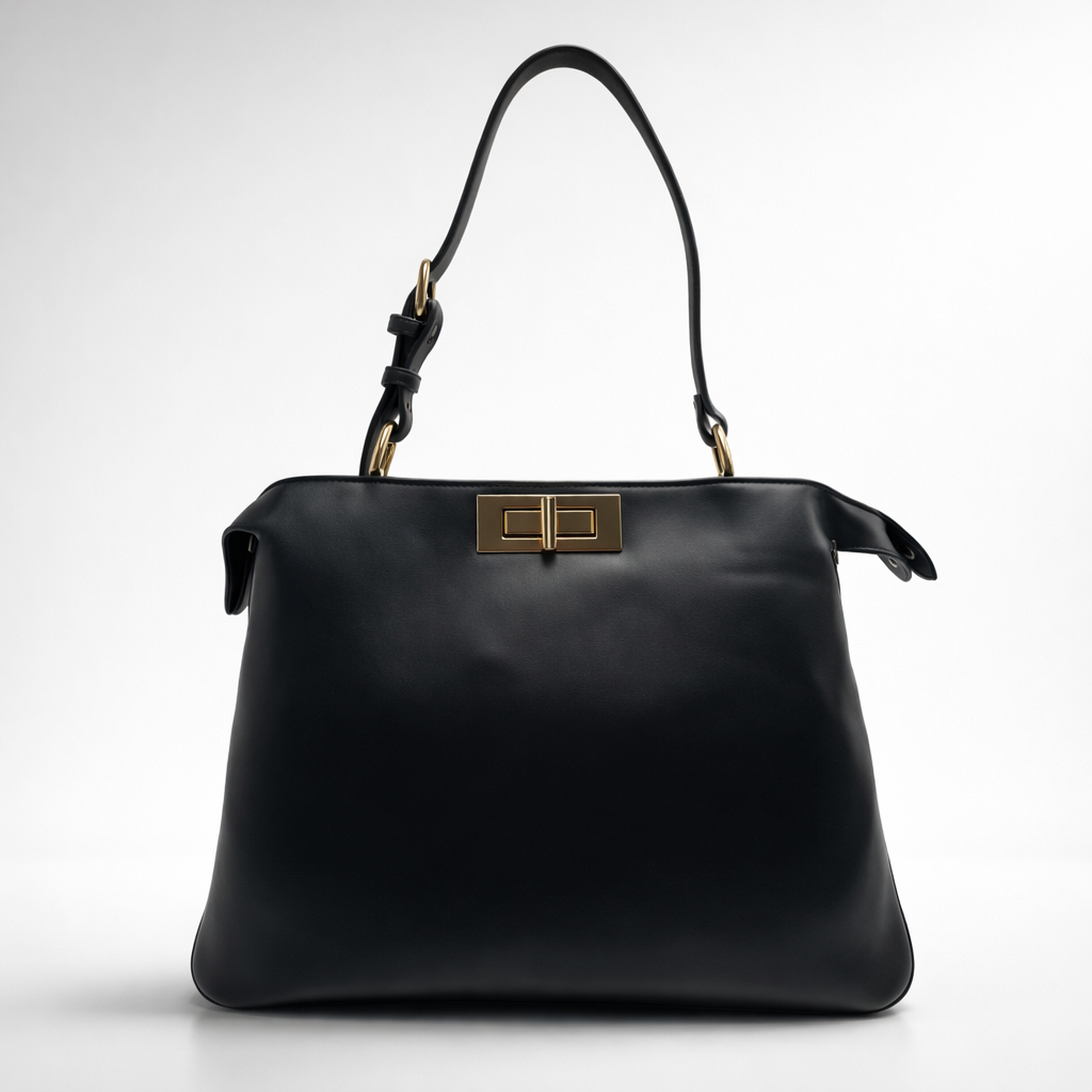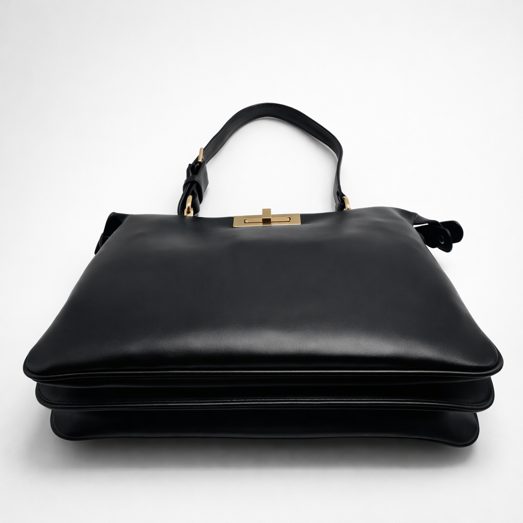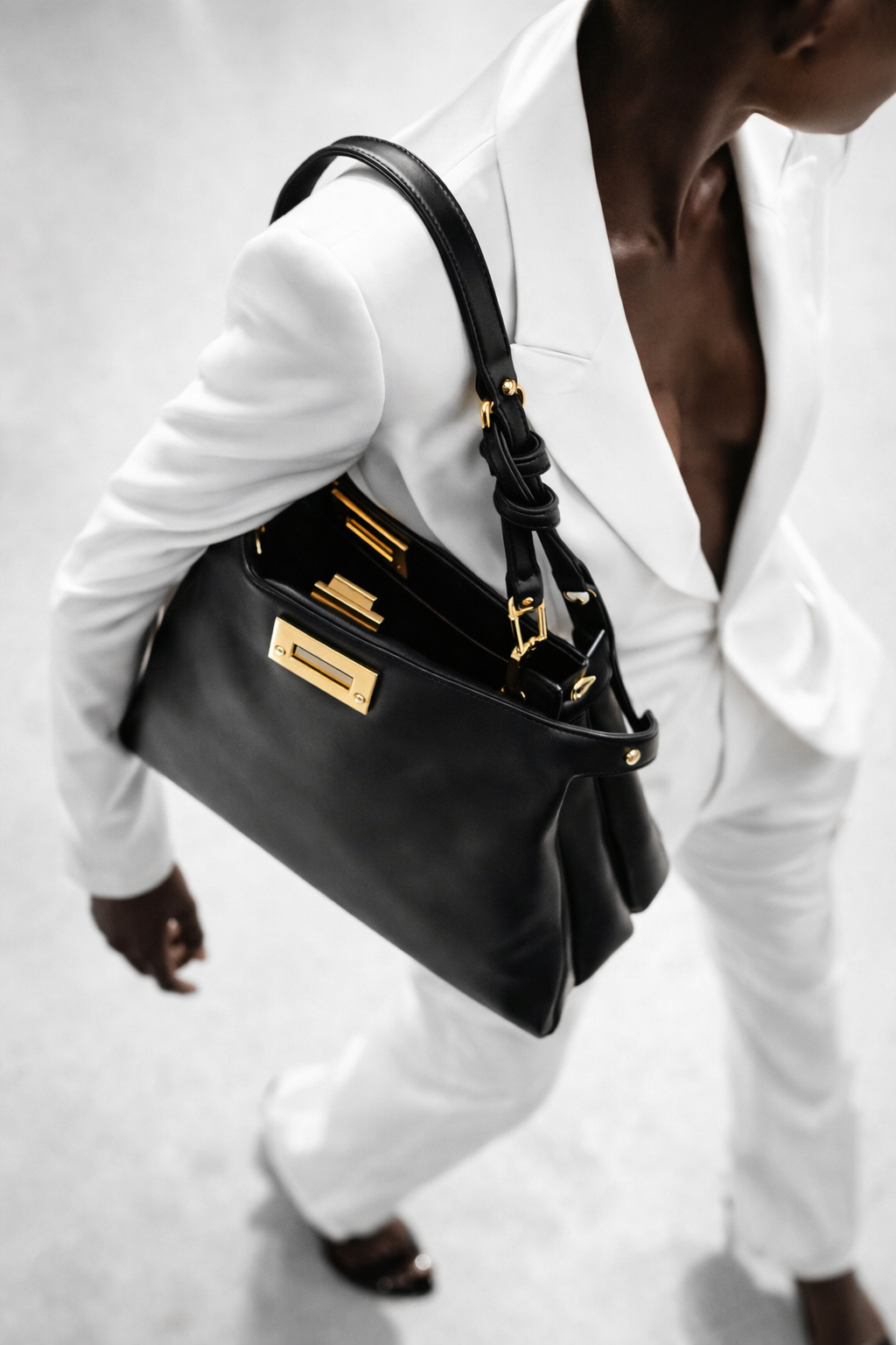 The gold hardware punctuates the surface like a final word — subtle, considered, and impossible to miss. Worn by hand in the evening or slung over the shoulder through the day, it brings a sense of composure to everything around it.