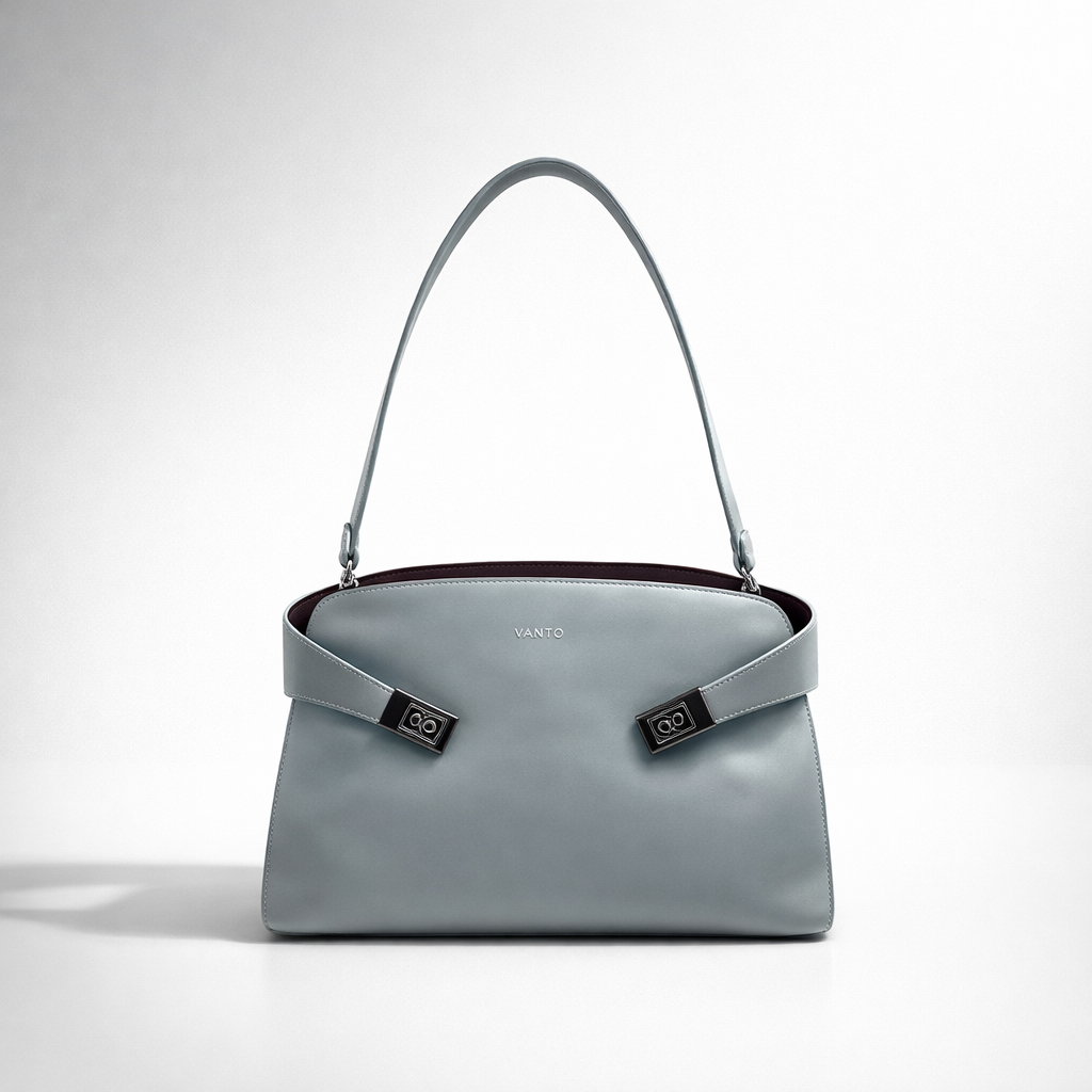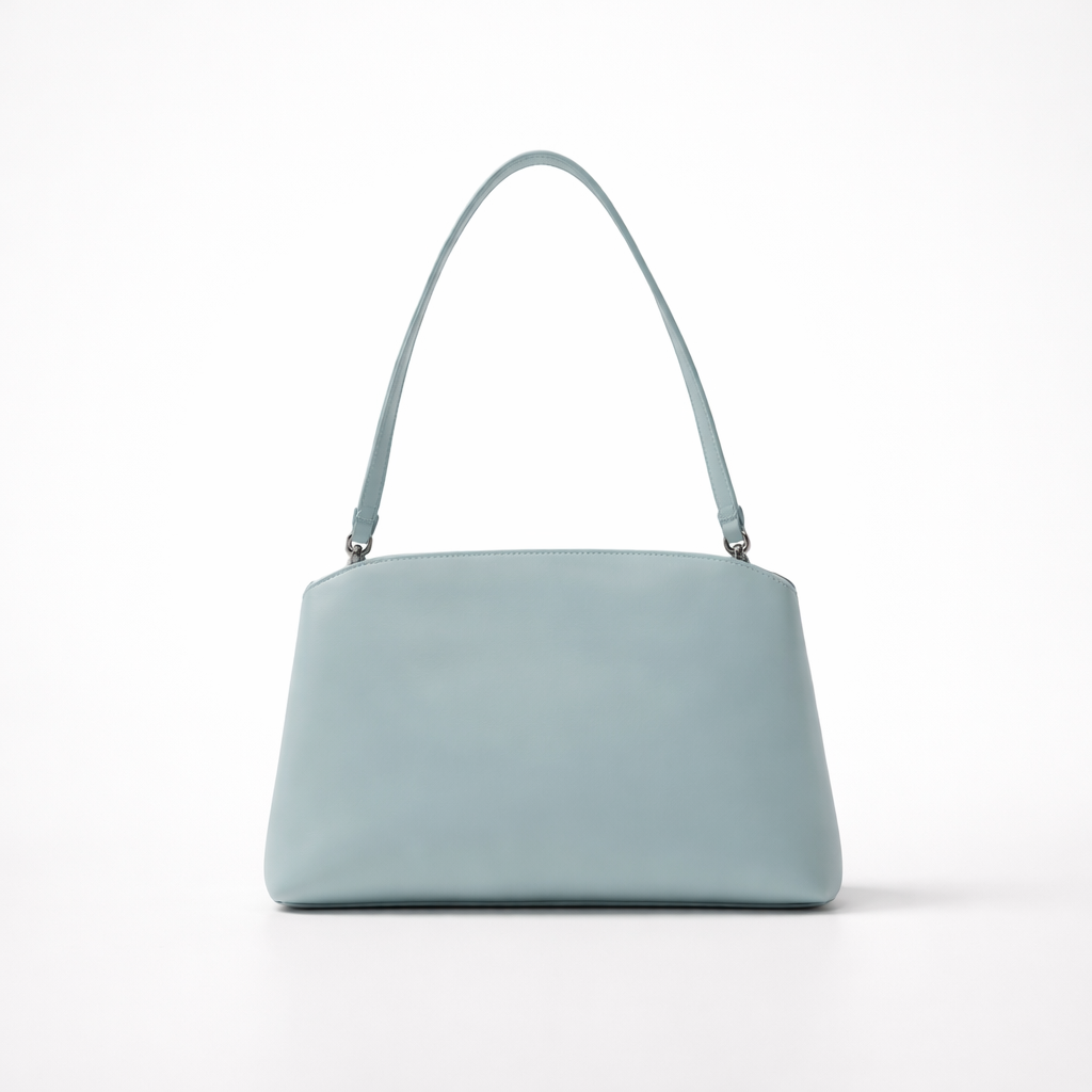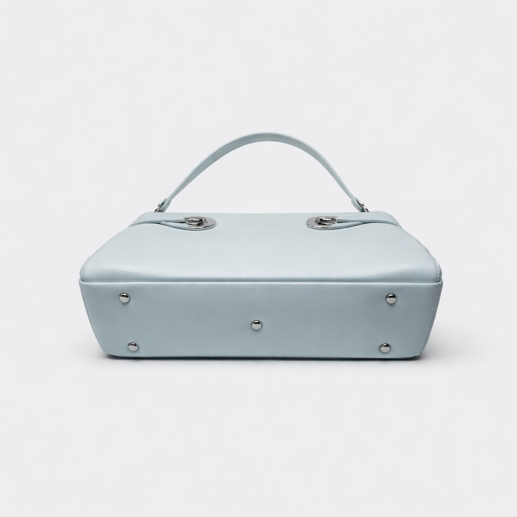 The Revenant in Steel Blue is one of the three standout pieces of Second Skin — Spring/Summer ’25. Its shape is clean and deliberate, the short strap designed to sit just off the shoulder, finished with sleek silver hardware that gives the pale surface a sharp edge.