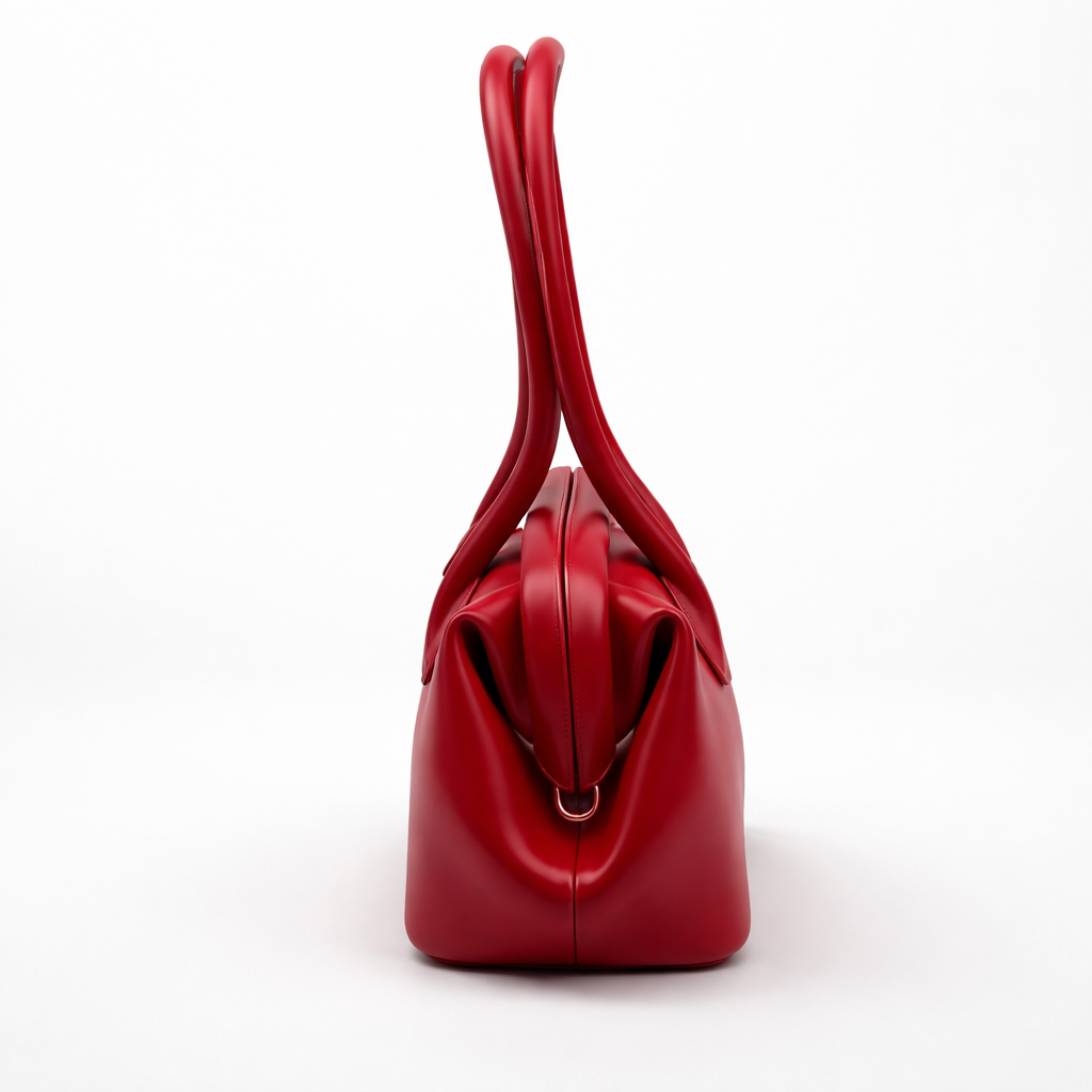 The sculptural form is softened by an open top with a subtle magnetic snap, creating a sense of ease that contrasts beautifully with the intensity of the colour.