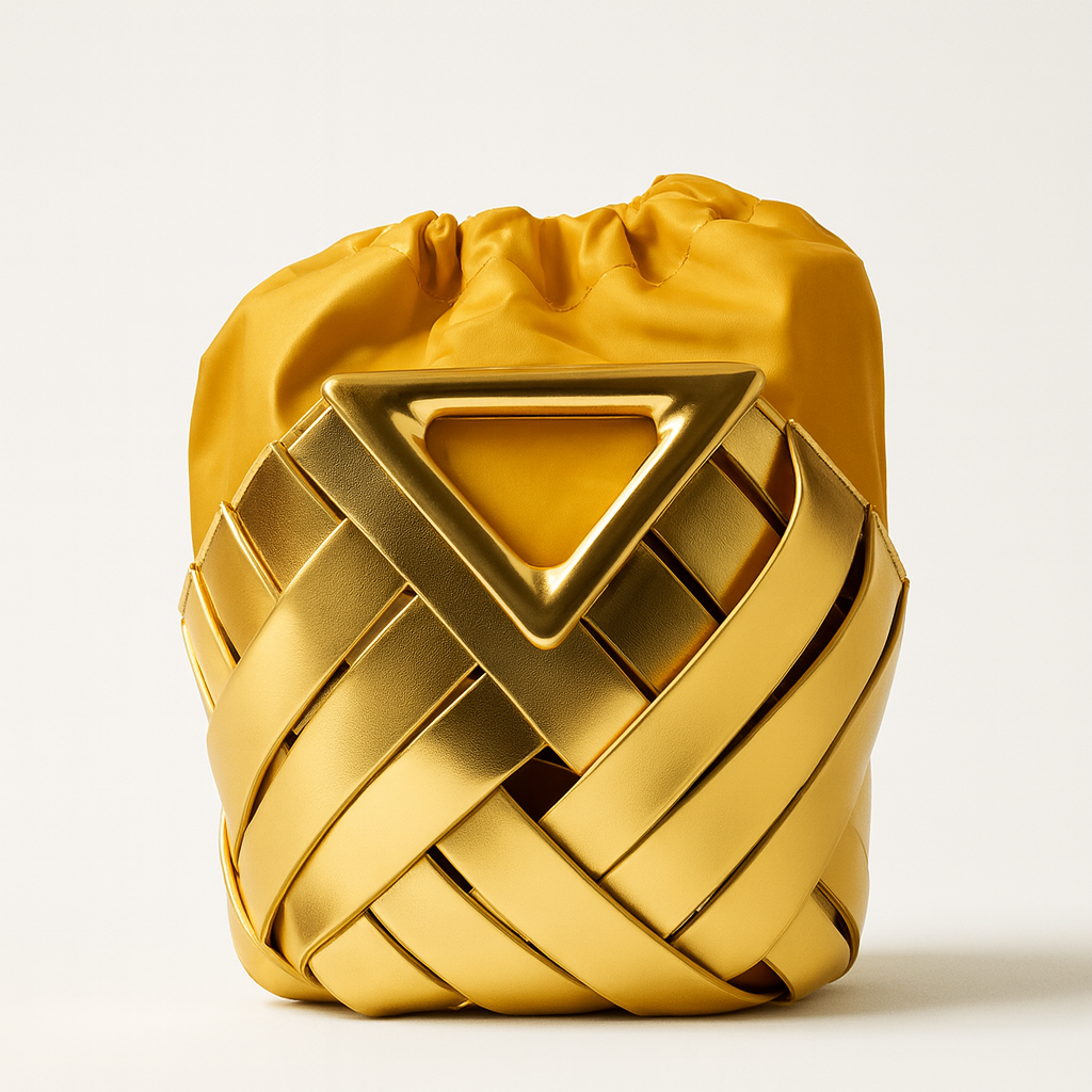 The Tapestry in Gold looks like a night out, but its medium-sized shape carries more than you’d expect. The metallic vegan leather glows like molten light, balanced by an inner drawstring pochette that keeps everything contained. Carry it by hand or crossbody.It’s drama, practicality, and glamour wrapped into one unmistakable piece.