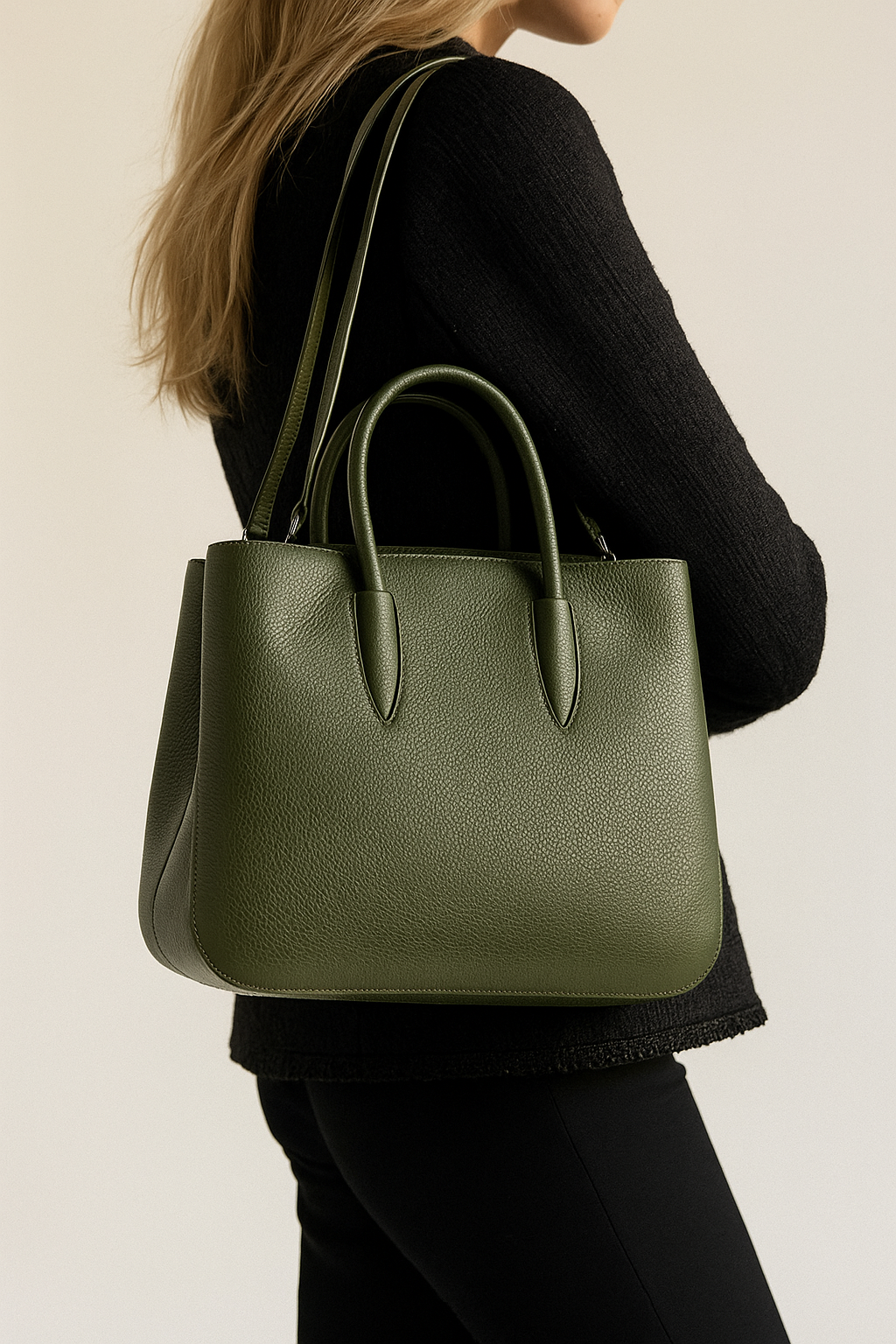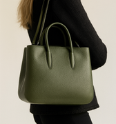 The Andare Tote is a masterclass in Italian craftsmanship.Its gracefully rounded curves and minimalist design make it a versatile piece for any wardrobe. Rendered in a rich olive shade, this tote exudes quiet luxury, perfectly complementing both formal and casual ensembles.
