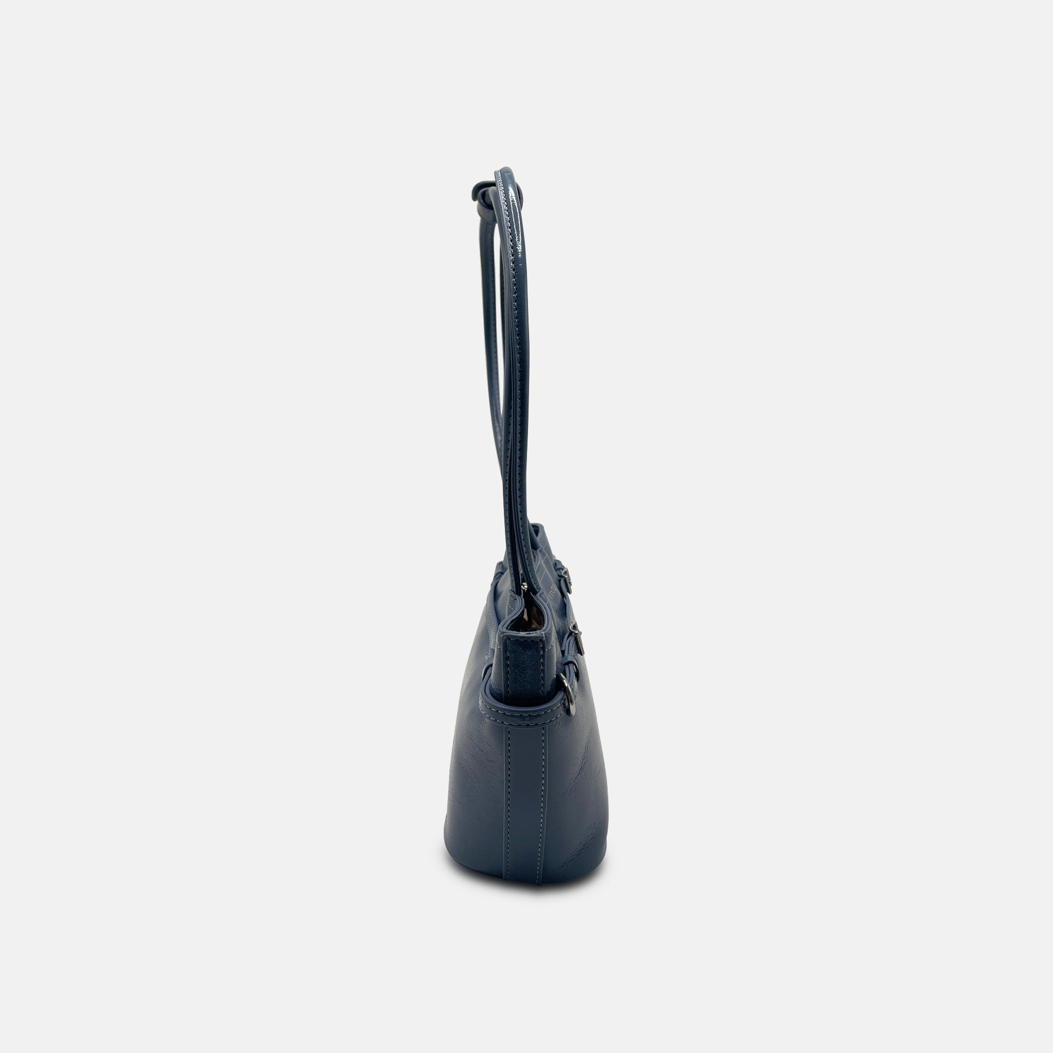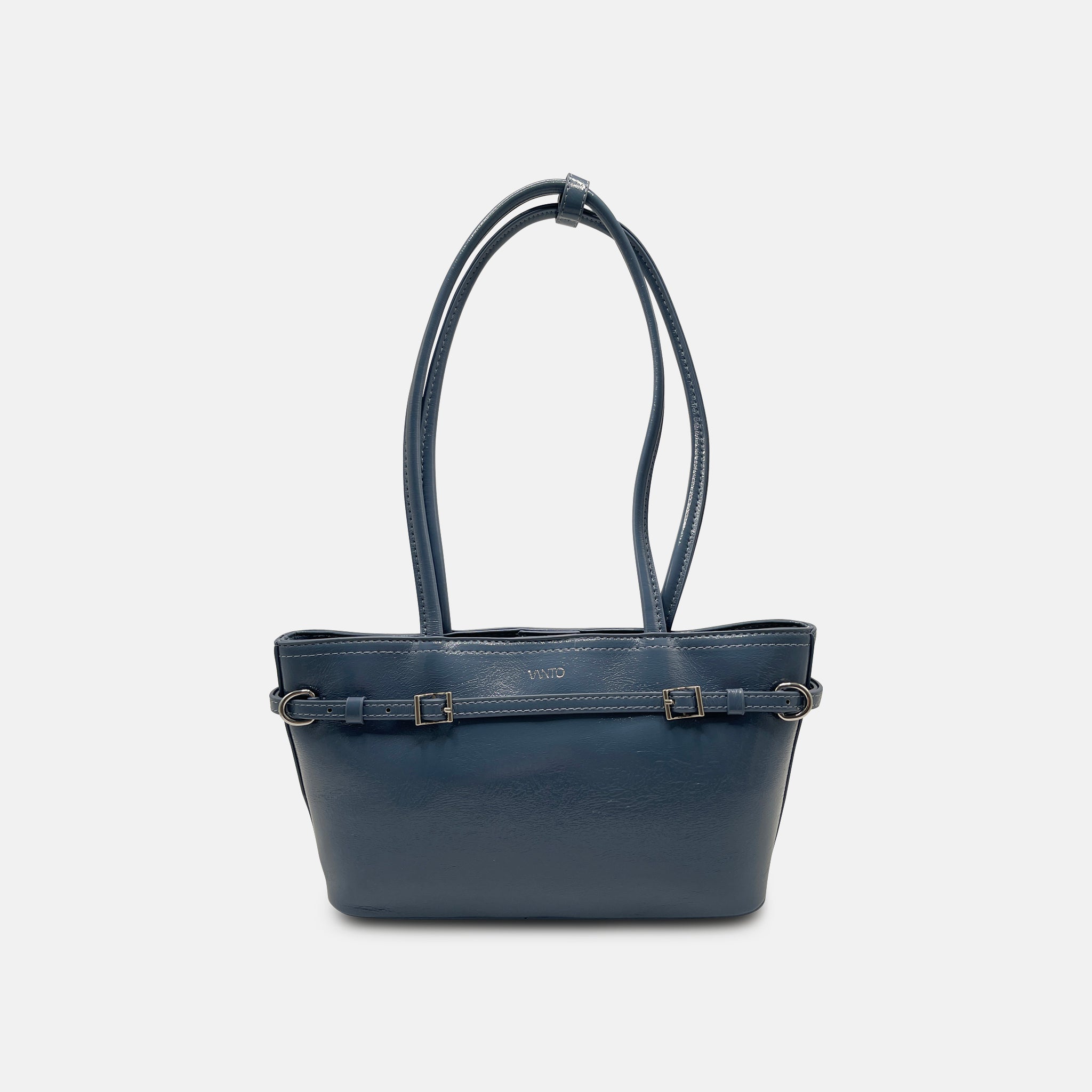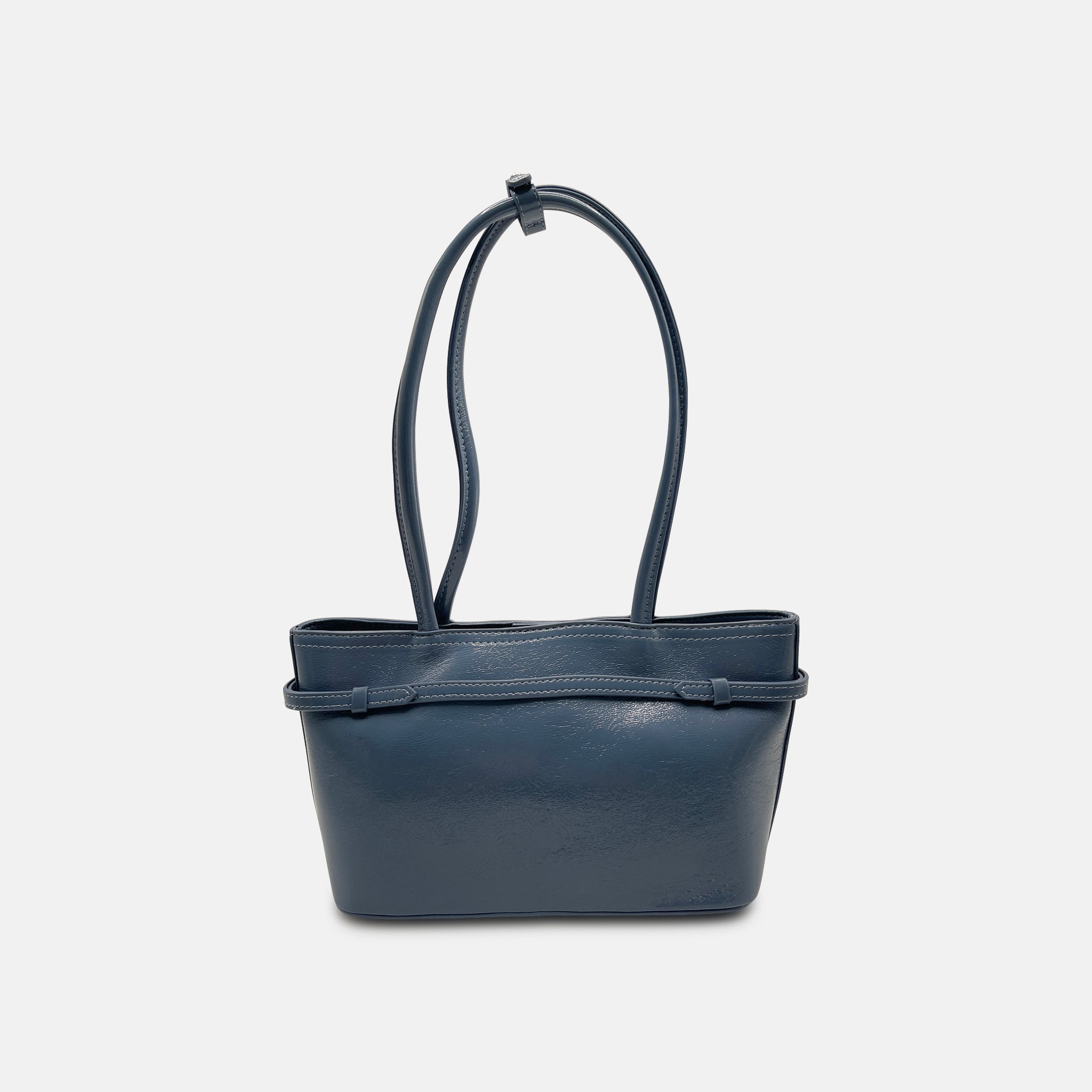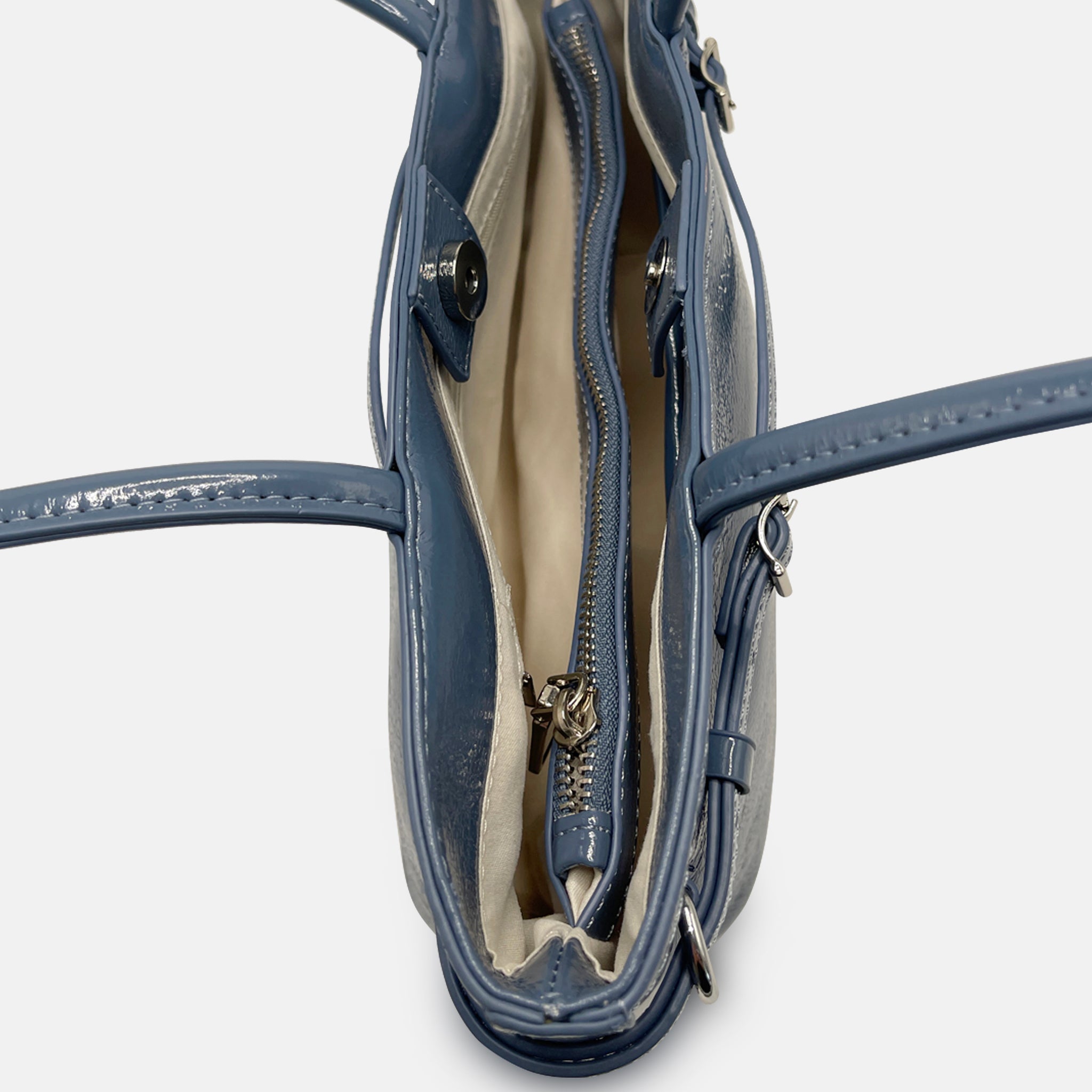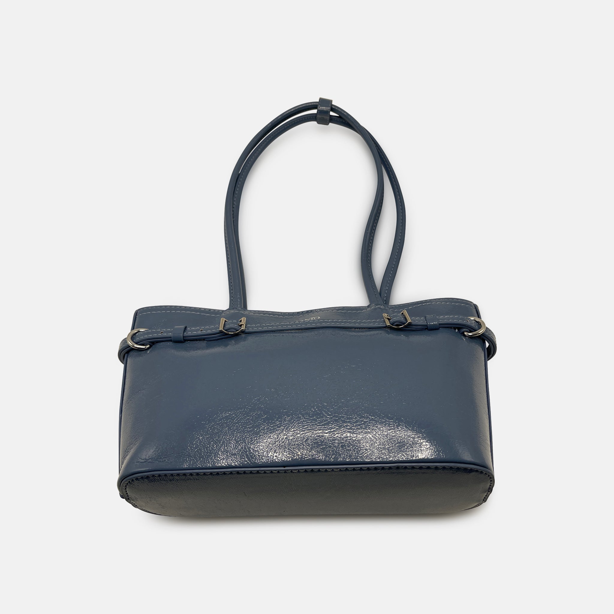 The Azurette in Blue is streamlined and confident. Its patent finish gives the colour depth, shifting as the light changes, while slim buckles at the sides add structure without fuss. The elongated straps let it sit naturally on the shoulder, keeping the proportions balanced and easy to wear.