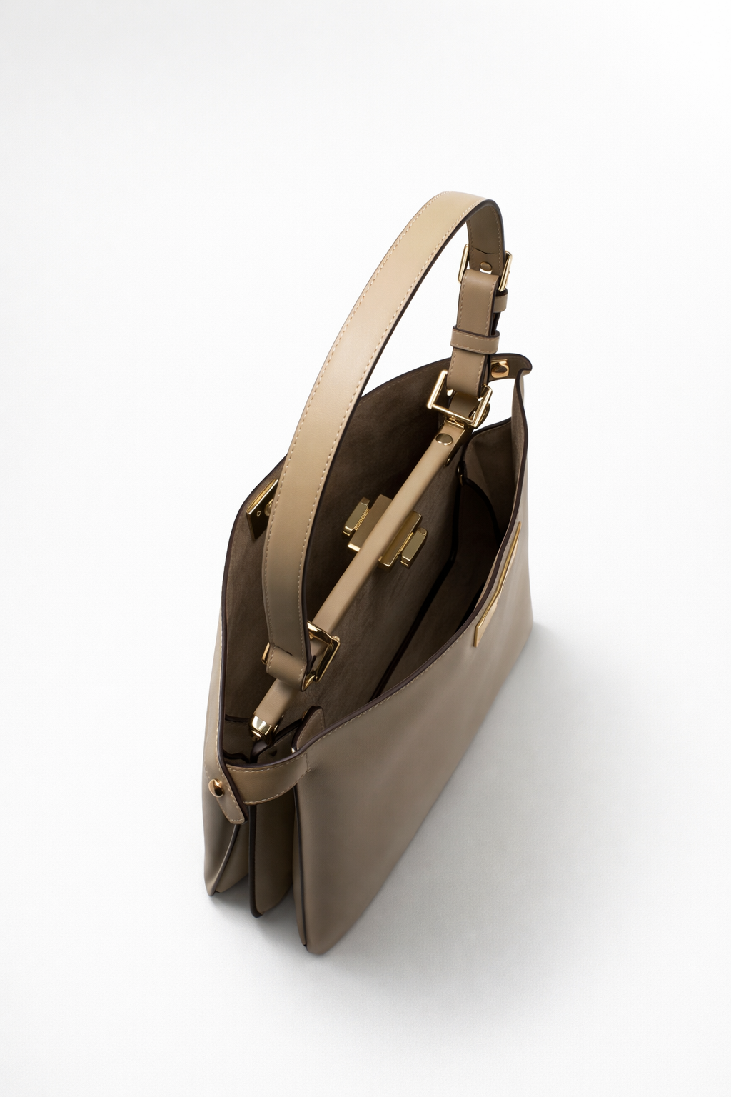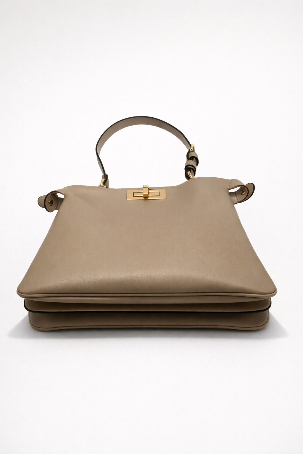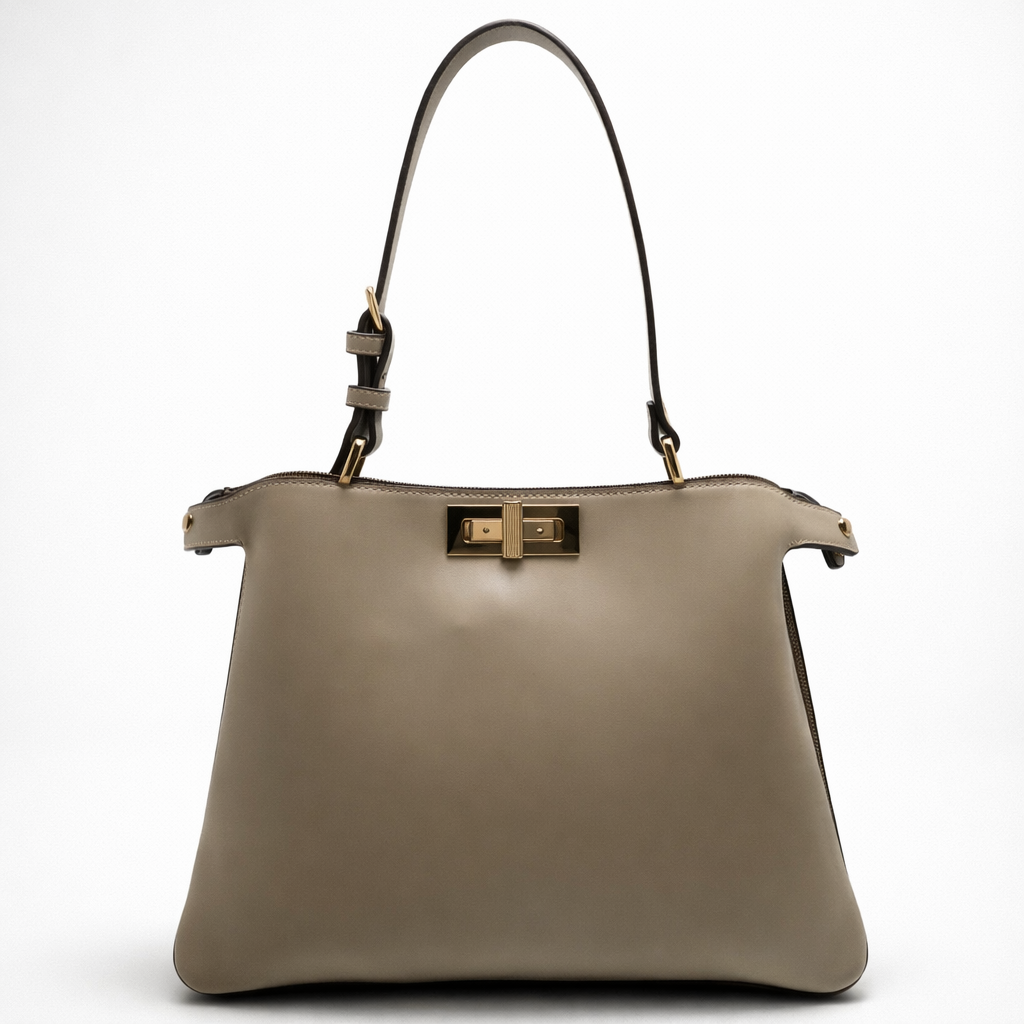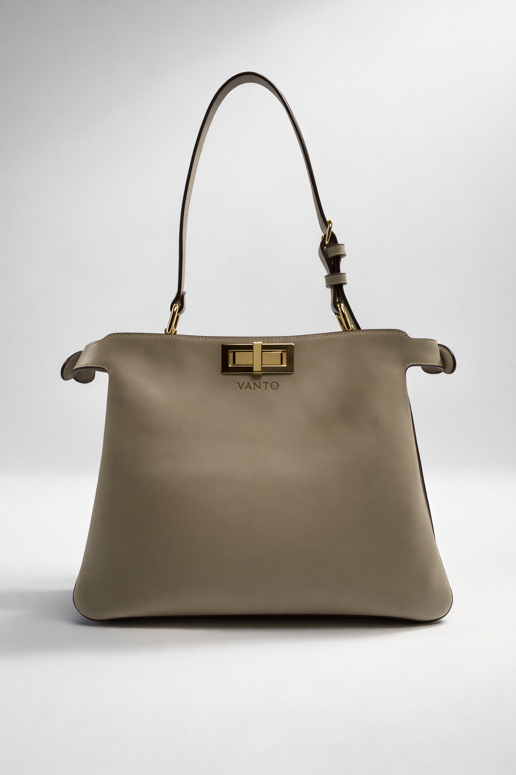 The gold hardware glows against the pale surface, adding warmth and distinction without tipping into excess. Carried slowly, deliberately, it feels refined and luminous — the kind of piece that draws attention without ever asking for it.
