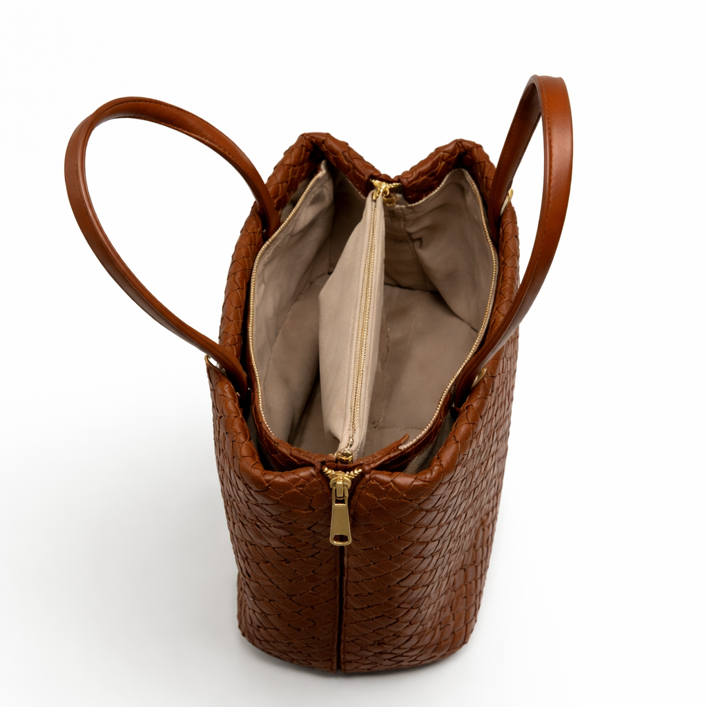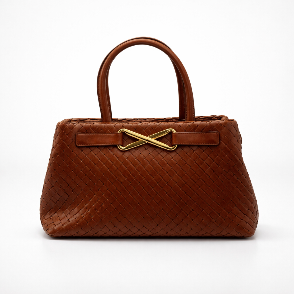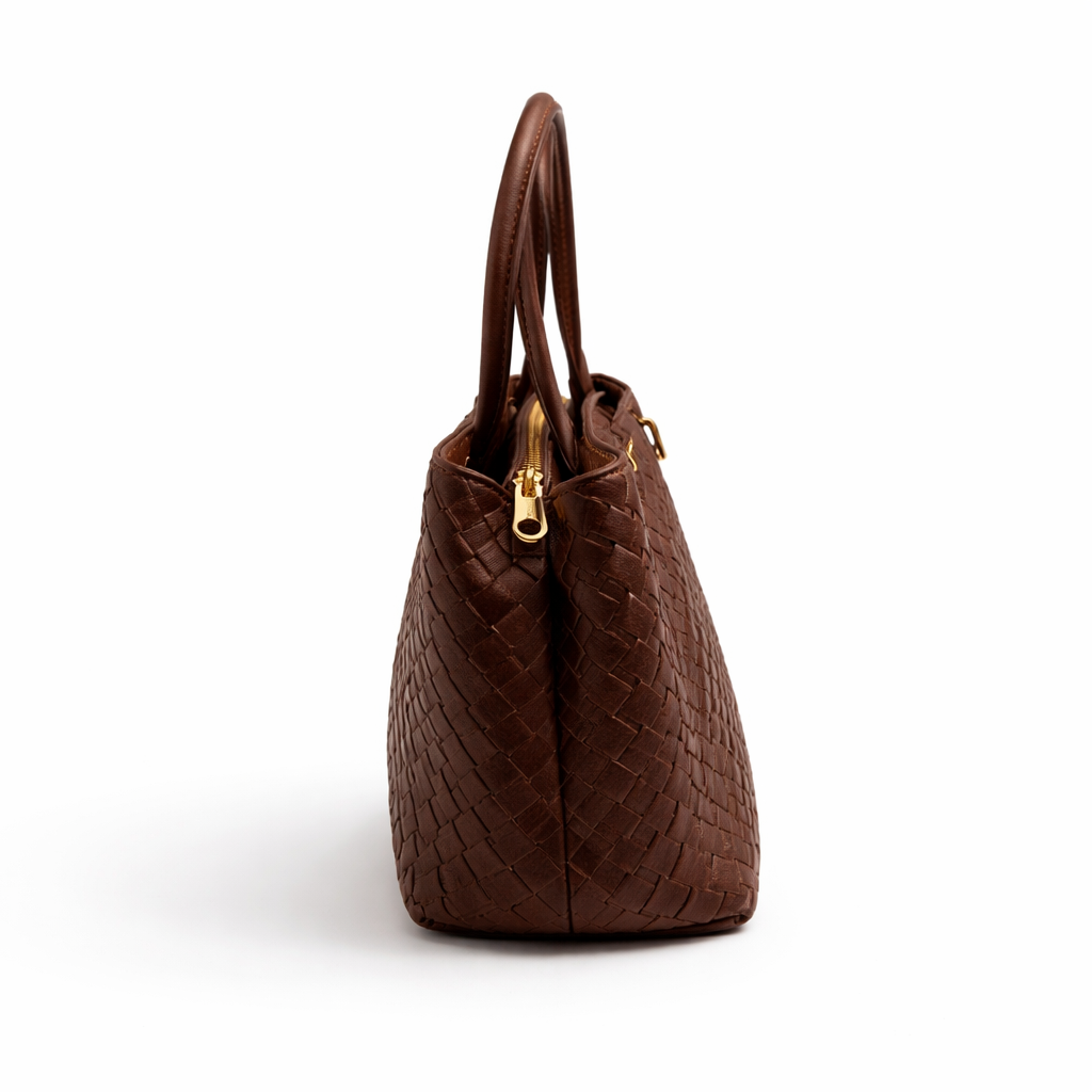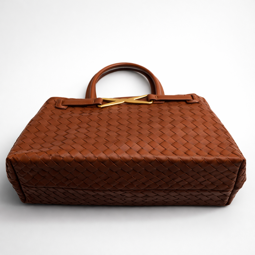 The intrecciato weave takes on a deeper character in this shade, revealing warmth and movement as the bag catches the light.