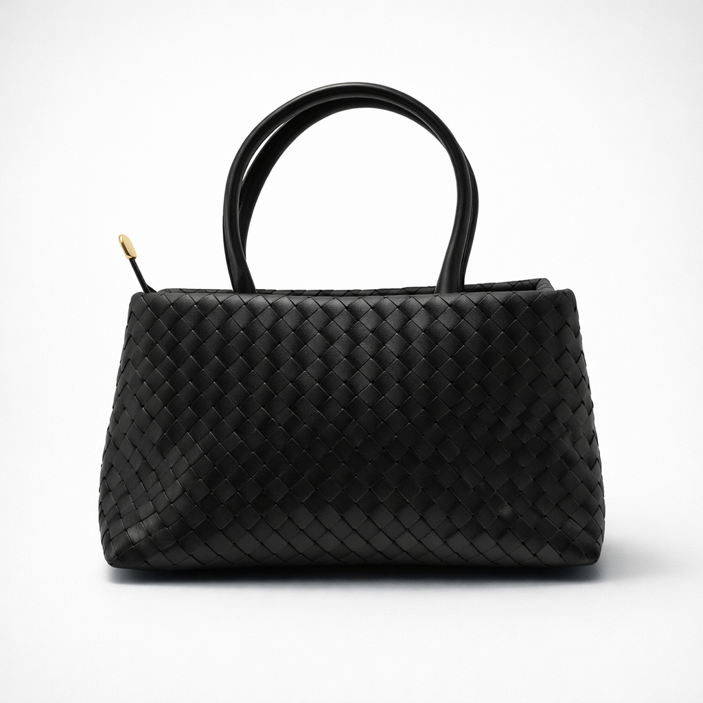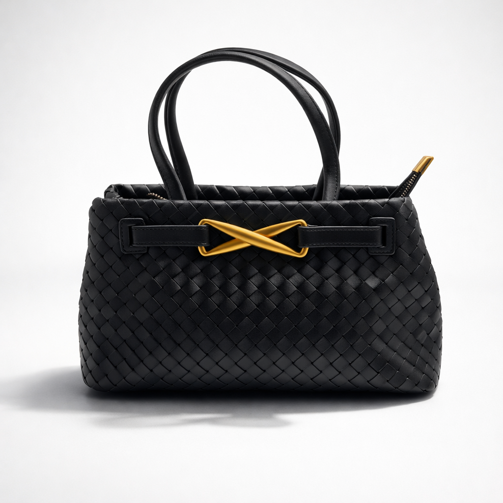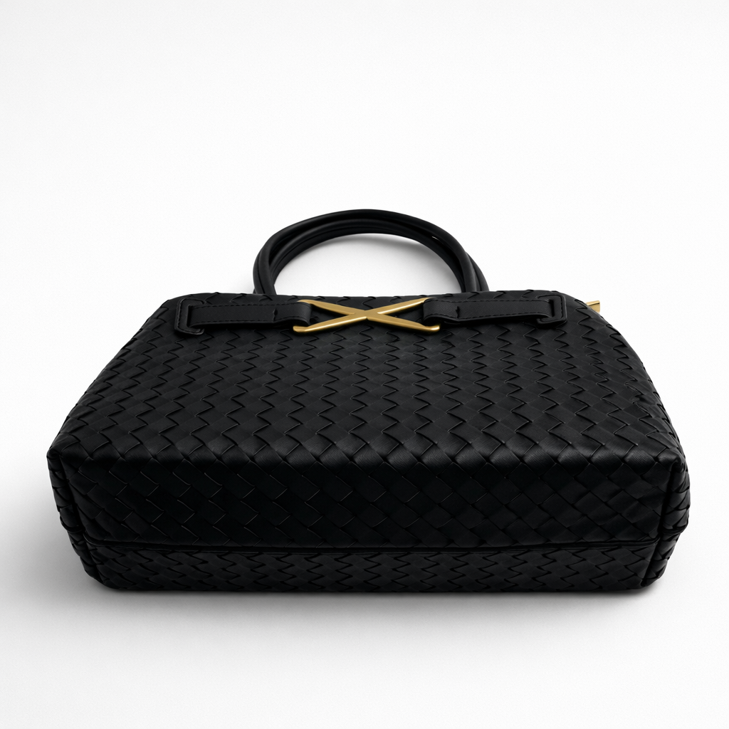 The crossed metal detail cuts through the weave with quiet confidence — a subtle interruption that elevates the design from classic to considered. Worn by hand or across the body, it maintains its shape and authority without feeling rigid.