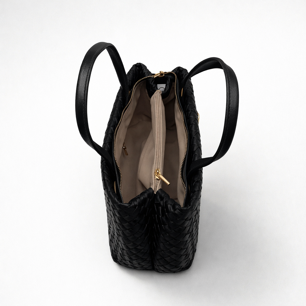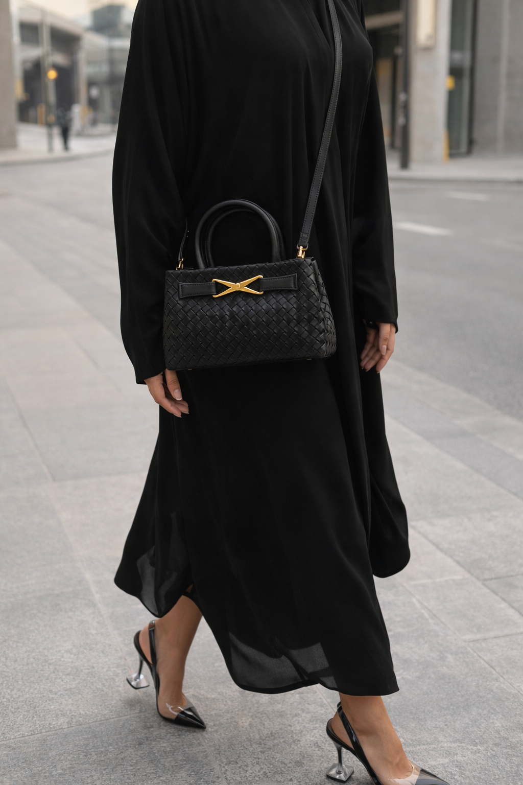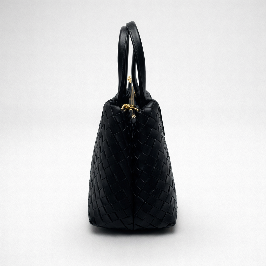 The crossed metal detail cuts through the weave with quiet confidence — a subtle interruption that elevates the design from classic to considered. Worn by hand or across the body, it maintains its shape and authority without feeling rigid.