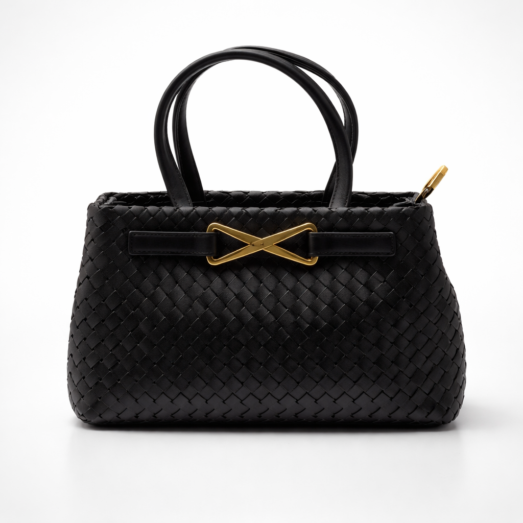 The intrecciato surface brings texture and depth, while the structured tote silhouette keeps the bag grounded and composed.The crossed metal detail cuts through the weave with quiet confidence — a subtle interruption that elevates the design from classic to considered. Worn by hand or across the body, it maintains its shape and authority without feeling rigid.