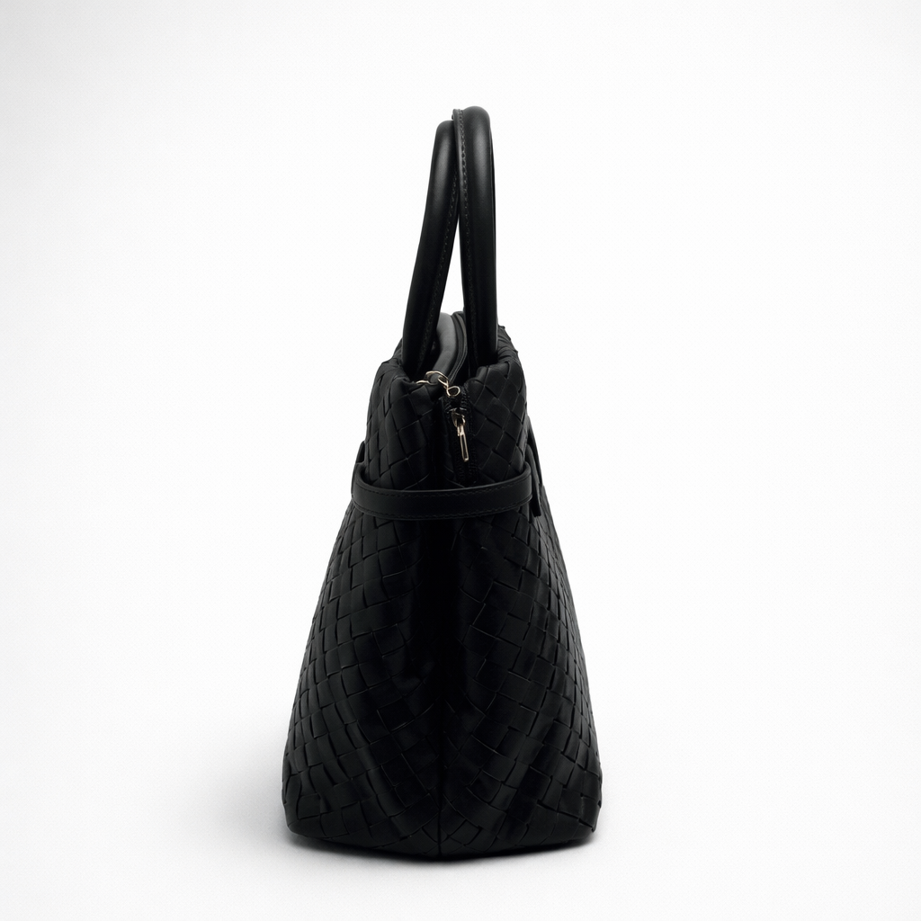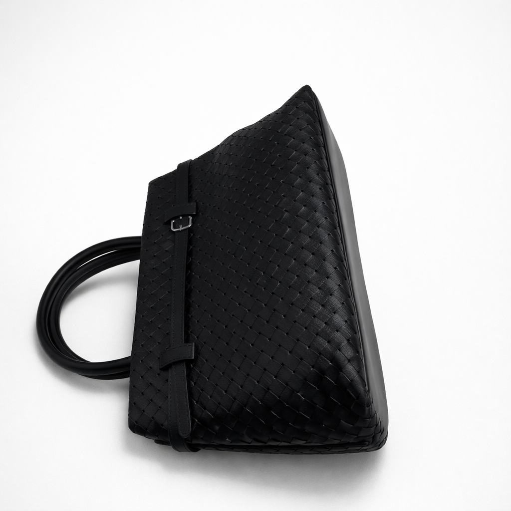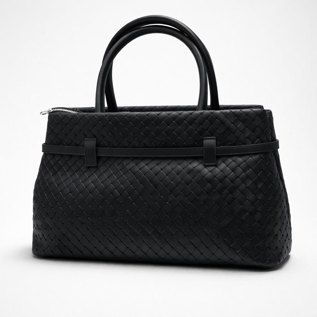 Its structured form is anchored by strong top handles, balanced by a strap that allows the bag to move seamlessly between hand-held and worn close. A restrained belt detail wraps the body, reinforcing the sense of control that defines the piece.
