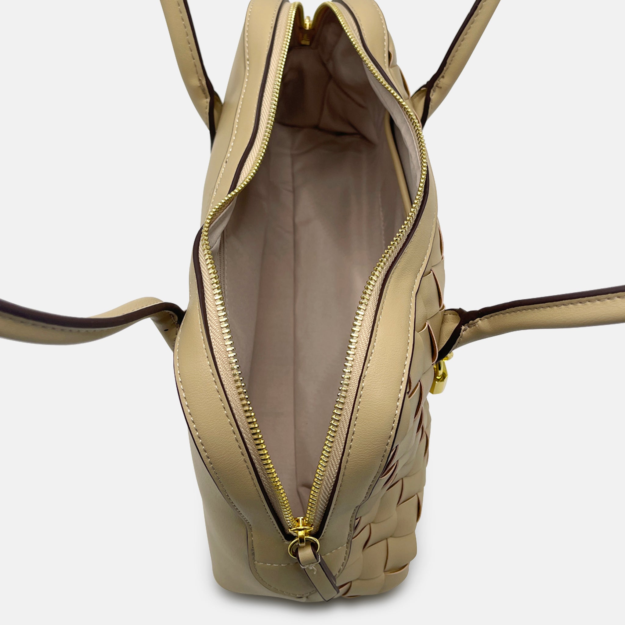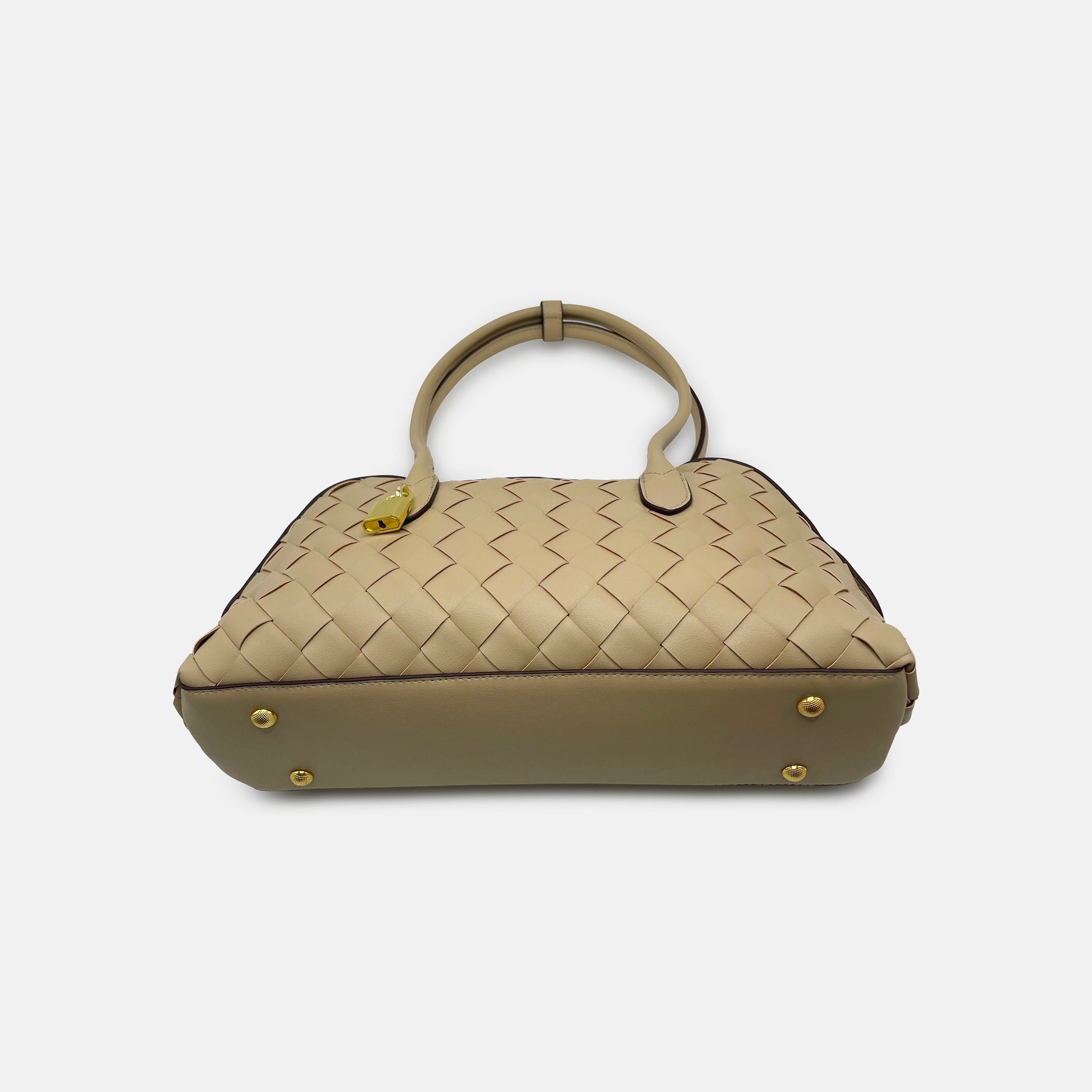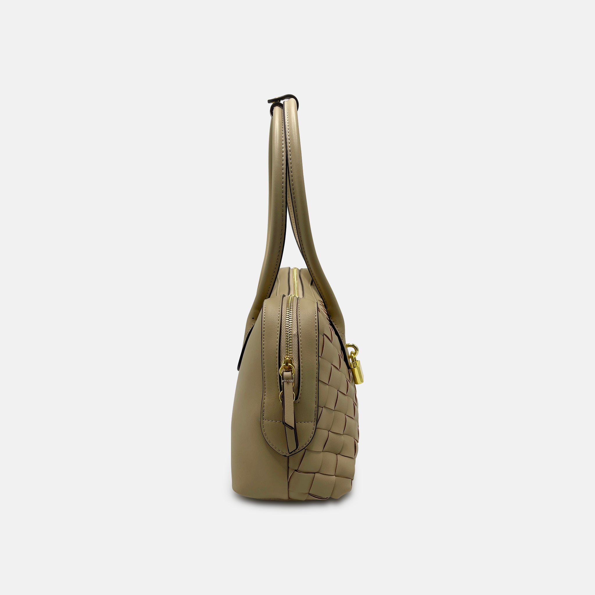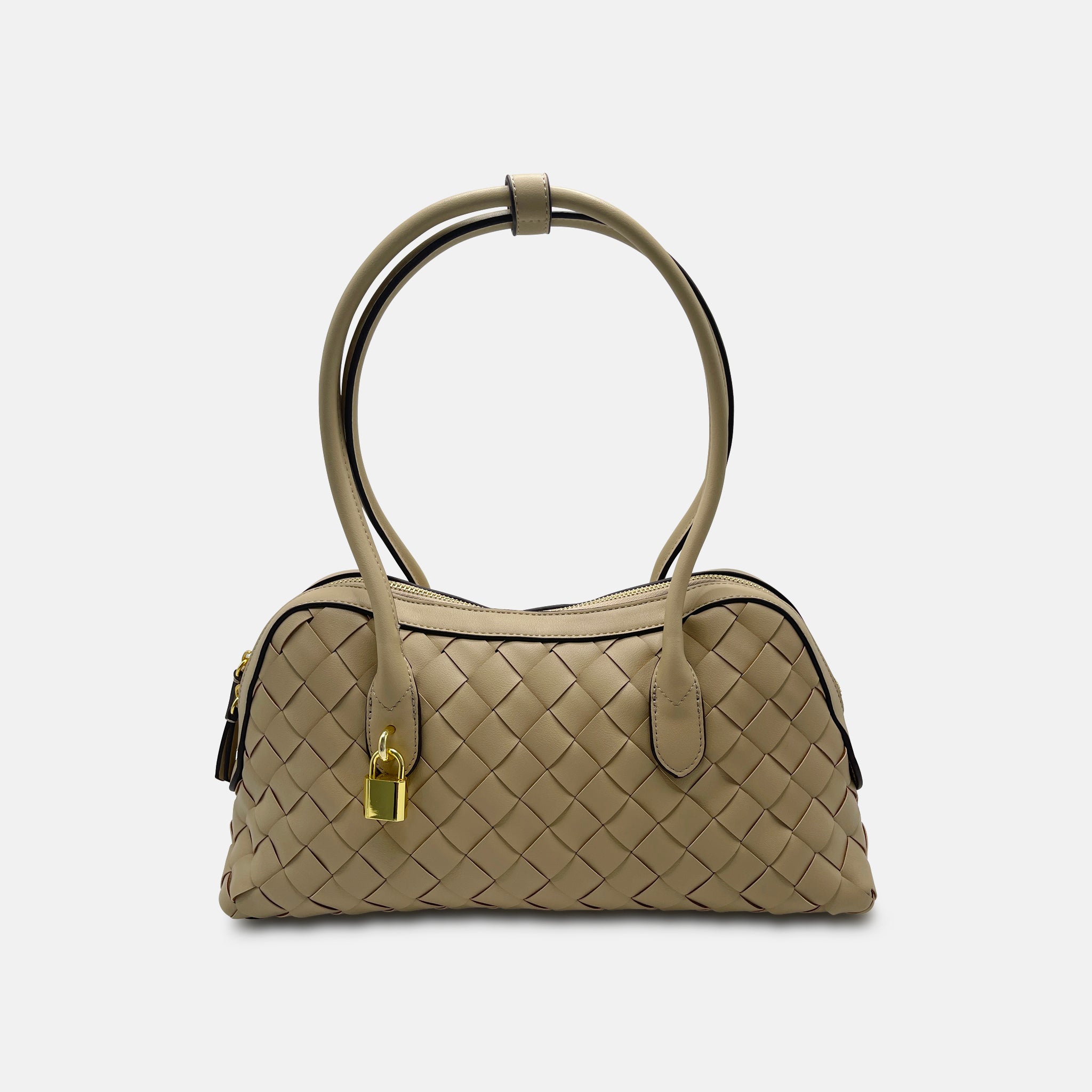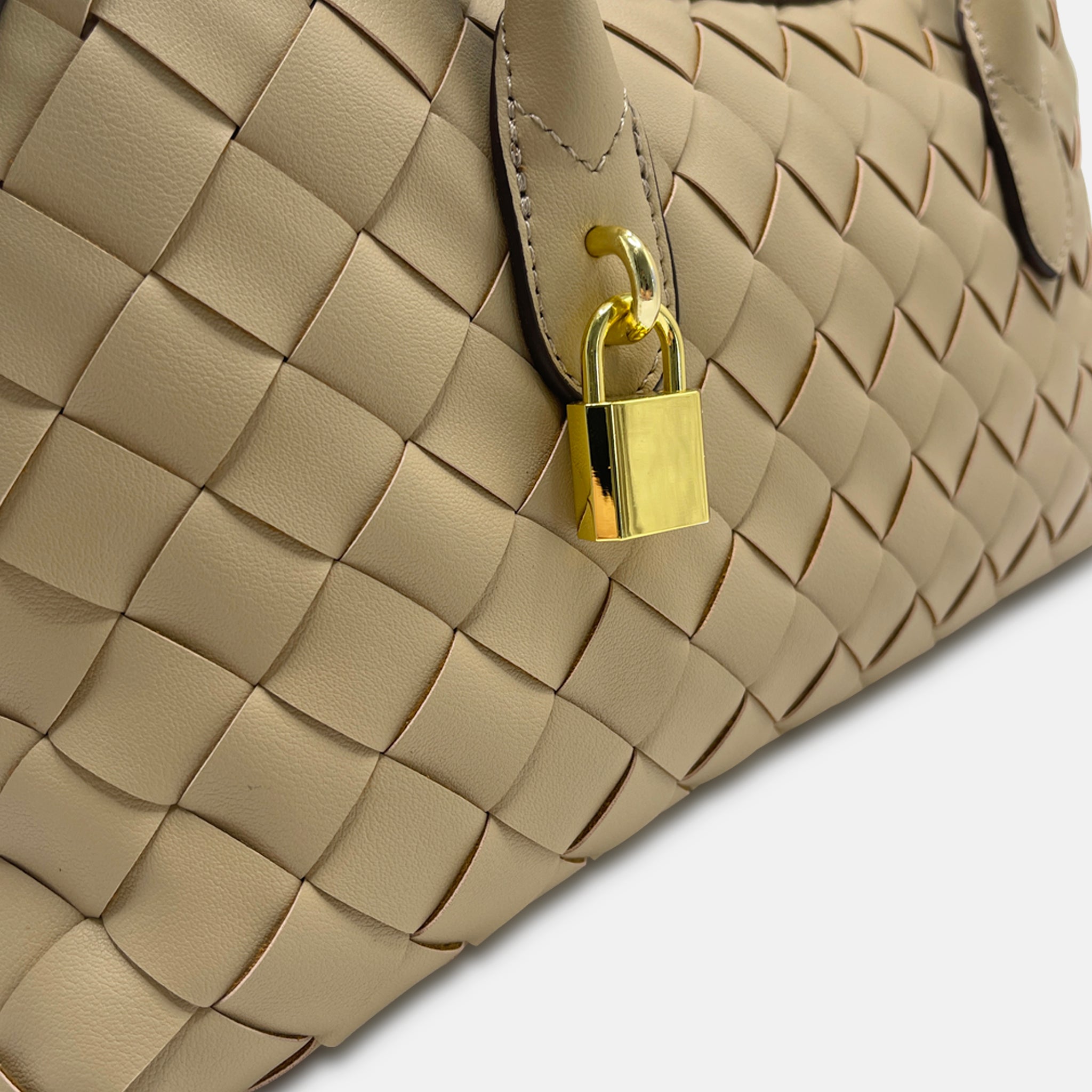 The Ledger in Beige carries presence without needing an introduction. Woven vegan leather gives it both texture and strength, while a gold padlock detail adds a note of polish that’s impossible to overlook.