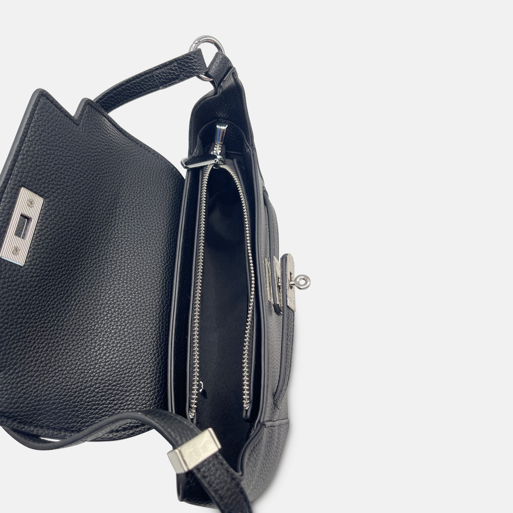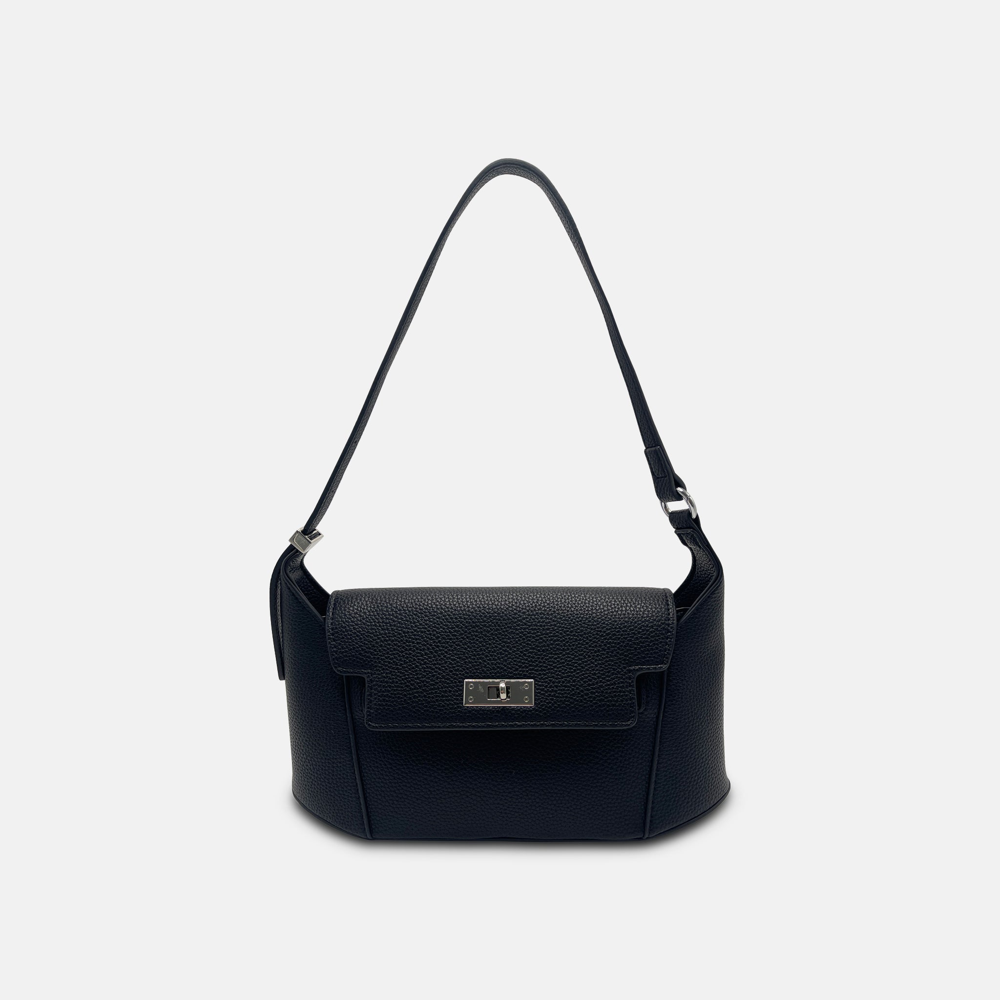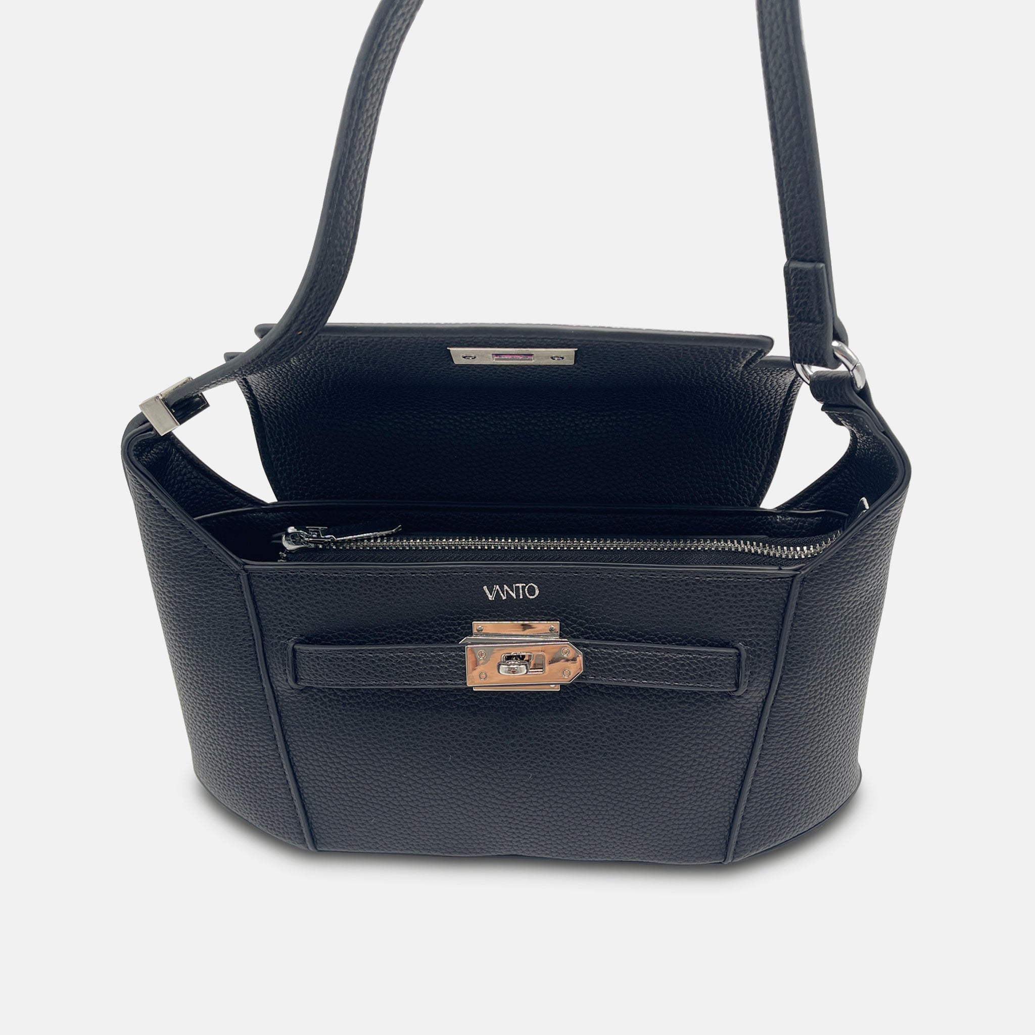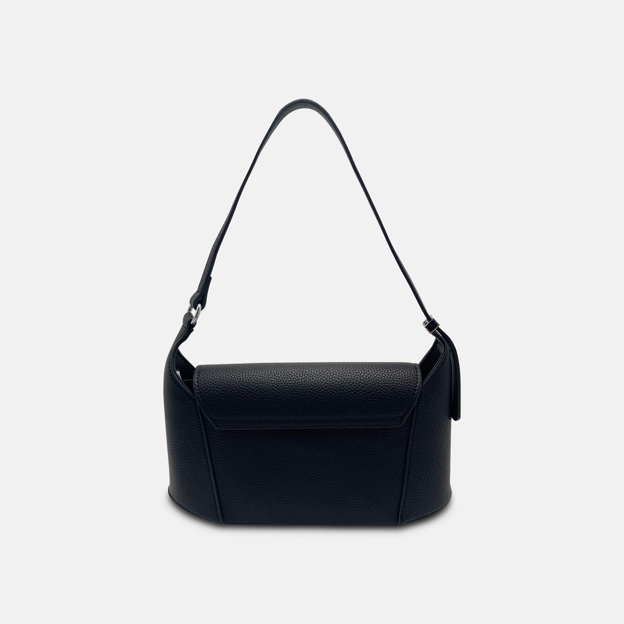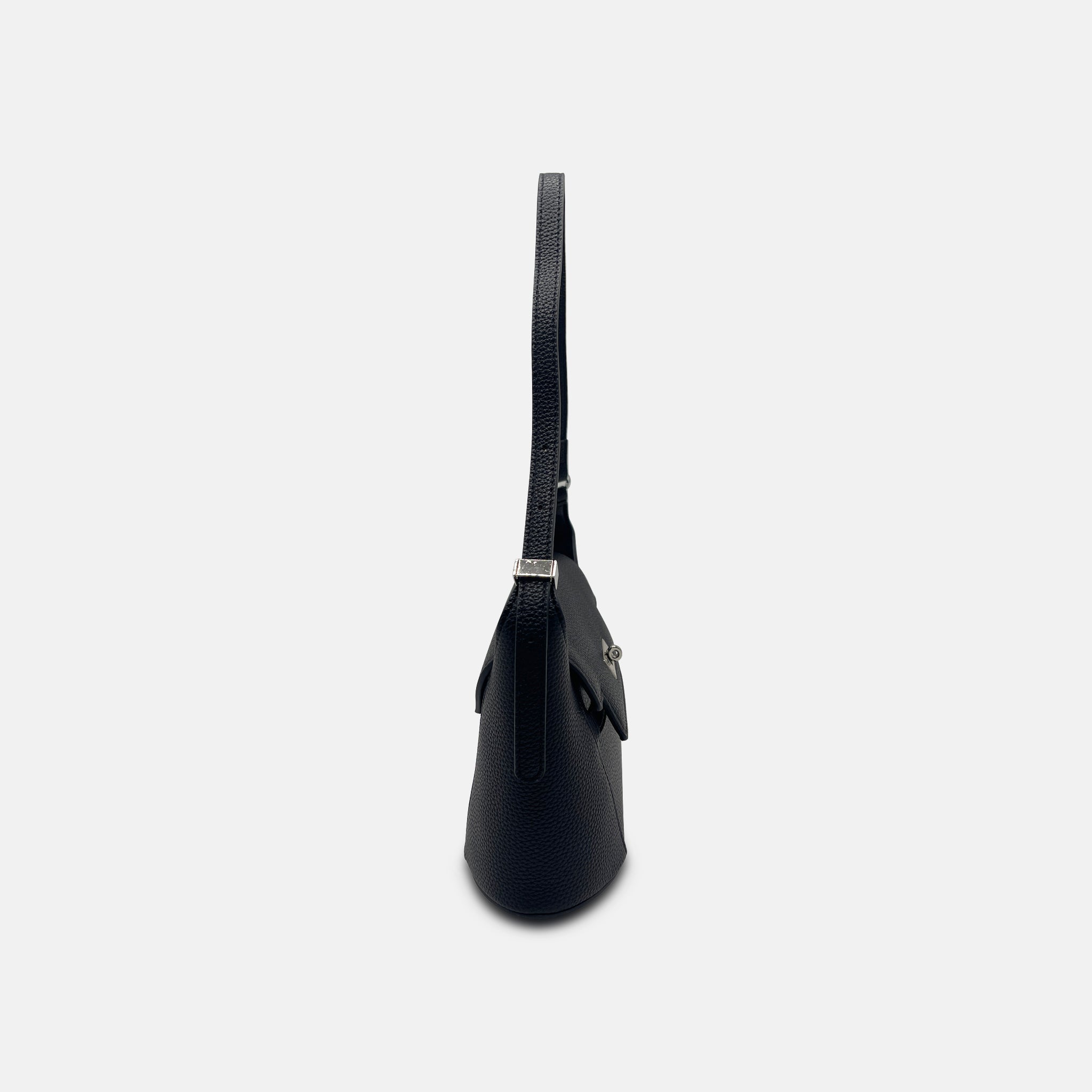 The Vesper in Black is built for evenings that carry on. Its elongated body tucks close under the shoulder, with a silver clasp flashing like a signal in the dark.