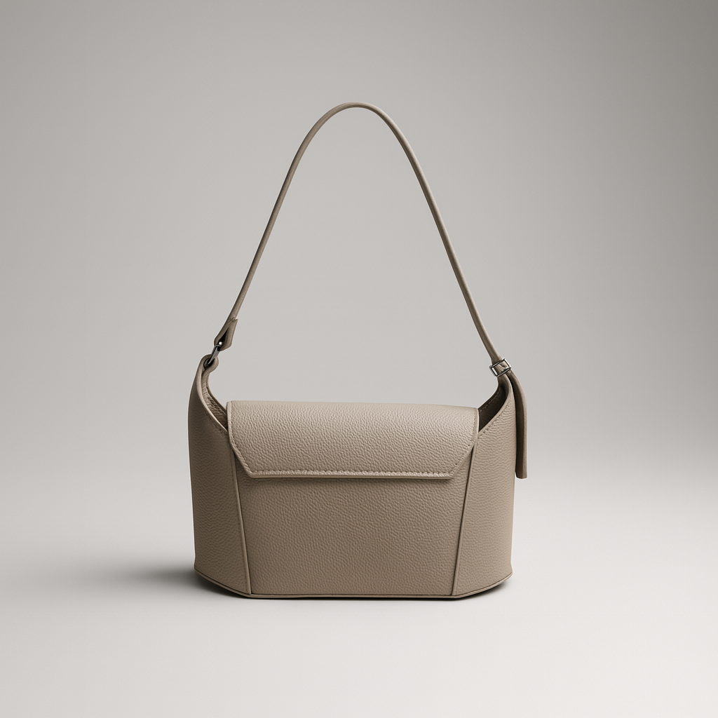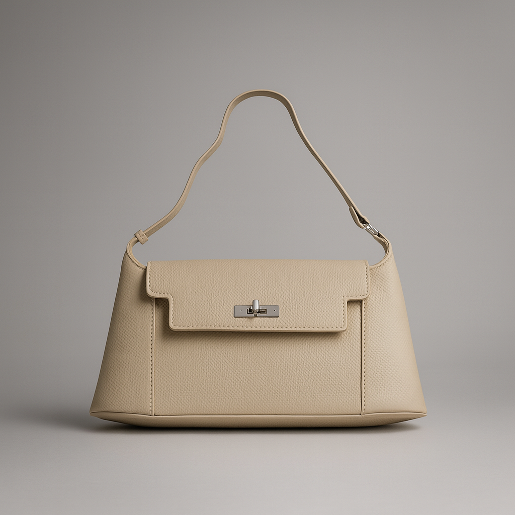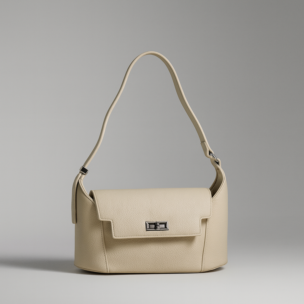 The Vesper in Ivory is subtle control. Its smooth surface and minimalist silhouette are framed by a clasp that holds the look together. Carried high, it disappears into your rhythm; carried low, it becomes the detail that catches the eye.